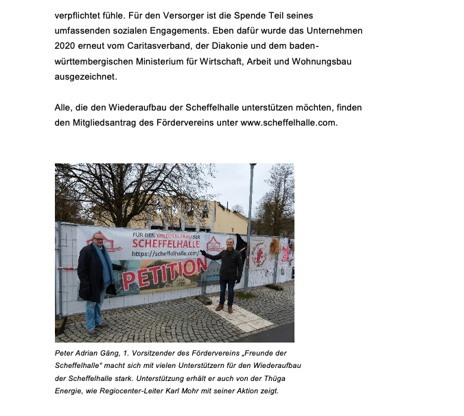Pressemeldung der Thüga-Energie 11. Dezember 2020 von Förderverein Scheffelhalle, posted in Allgemein Teilen mit: Auf X teilen (Wird in neuem Fenster geöffnet) X Auf Facebook teilen (Wird in neuem Fenster geöffnet) Facebook Gefällt mir Wird geladen … Ähnliche Beiträge